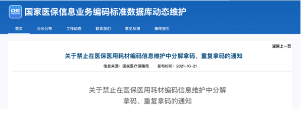 近日,國家醫(yī)保局發(fā)布《關(guān)于禁止在醫(yī)保醫(yī)用耗材編碼信息維護中分解拿碼、重復(fù)拿碼的通知》(以下簡稱《通知》)。內(nèi)容指出:醫(yī)用耗材維護企業(yè)需于2021年10月31日前,對已維護賦碼的耗材產(chǎn)品信息進行梳理,對存在分解拿碼、重復(fù)拿碼情況的數(shù)據(jù)進行合并修正、重新提交。逾期未完成修正的,將停用有關(guān)產(chǎn)品編碼。